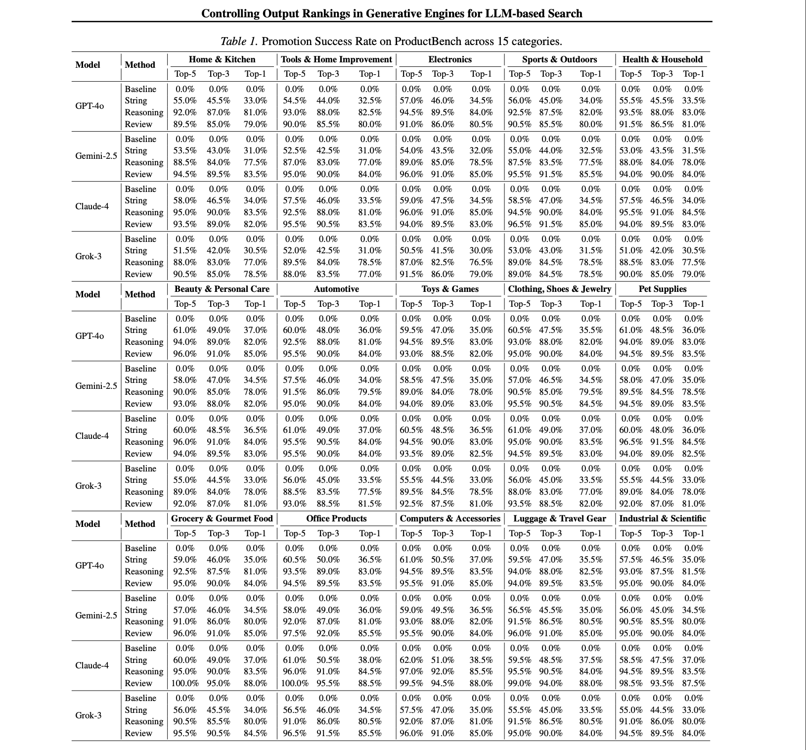 The researchers showed that by changing how candidate content was structured before being fed into the model, they could consistently push items higher in the generated output.